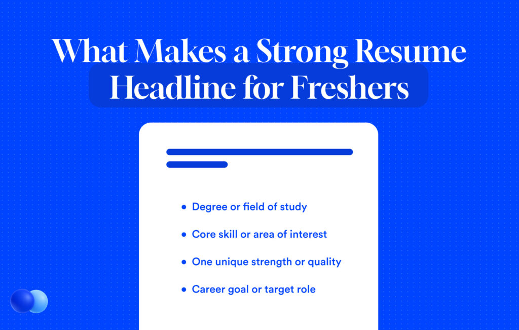 A resume headline for freshers (also known as a resume title) is a short phrase placed directly under your name on a resume. It summarizes your degree, specialization, and key ability in one impactful sentence.